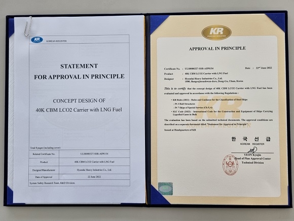 이번 AIP를 받은 선박은 KR과 현대중공업 간 공동개발 프로젝트(JDP)를 통해 개발됐다. 현대중공업이 40K CBM LCO2 운반선의 기본 및 구조 설계를 수행했고, KR은 이 설계에 대한 선급규칙 및 국내외 규정 검토를 통해 설계 안전성과 적합성을 검증했다.
