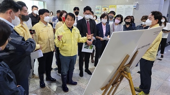 나동연 양산시장 당선인 인수위원회가 공식 업무보고를 마치고 지역현황 파악에 속도를 내고 있는 가운데 지난 27일 본격 장맛비 속에서 2차 현장활동을 펼쳤다.