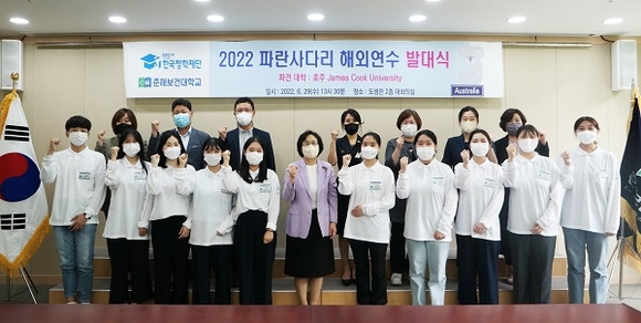 지난 29일 도생관 대회의실에서 춘해보건대학교는 ‘2022 파란사다리 해외연수 발대식’을 개최하고 단체 기념촬영을 하고 있다.