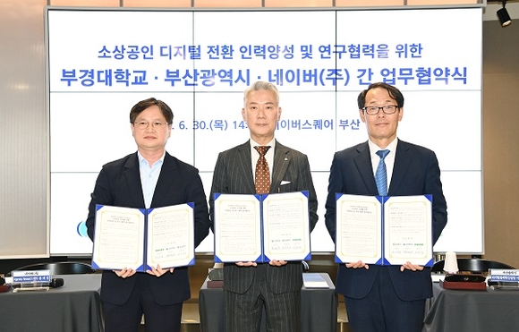 세 기관은 이날 오후 부산 해운대에 위치한 네이버 스퀘어 부산에서 협약식을 하고, 부산지역 소상공인 디지털 전환 관련 실무 인력양성과 연구 협력을 통해 지역경제 활성화에 힘쓰기로 했다.