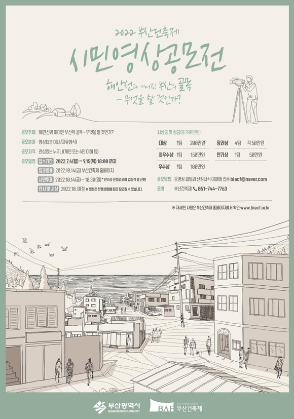 부산시와 부산건축제조직위원회는 '2022 부산건축제 시민영상 공모전'을 오는 15일까지 개최한다고 4일 밝혔다.