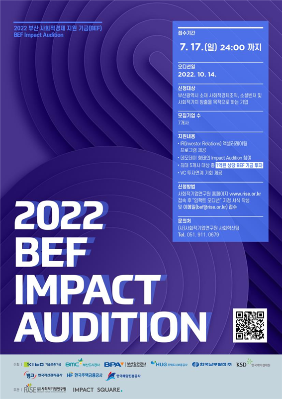 부산지역 9개 공공기관은 오는 17일까지 '부산 사회적경제 지원 기금(BEF)'을 통한 사회적기업 성장 지원 프로그램인 '2022 BEF 임팩트 오디션' 참가 기업을 모집한다고 4일 밝혔다.