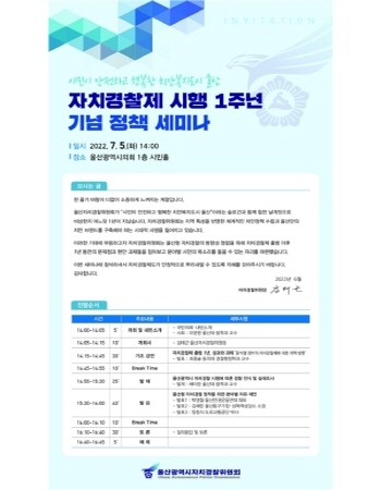 울산시자치경찰위원회(위원장 김태근)는 5일 오후 2시 시의회 1층 시민홀에서 ‘자치경찰제 시행 1주년 기념 정책 토론회(세미나)’를 개최한다고 밝혔다.