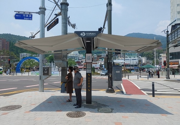 경남 창원시는 장마 후 본격적인 무더위를 앞두고 폭염으로 인한 인명피해를 예방하기 위해 유동인구가 많은 창원종합버스터미널 앞 사거리 등 10곳을 선정해 스마트그늘막을 시범 설치했다고 5일 밝혔다.