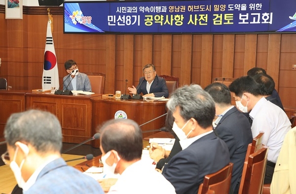 경남 밀양시는 5일 박일호 시장 주재로 국·소장 이하 담당부서장이 참석한 가운데, 선거기간 제시했던 공약에 대해 검토한 사항을 주관부서장이 직접 보고하는 자리를 가졌다.