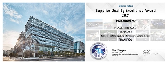 넥센타이어는 ‘2021 GM 올해의 우수 공급 업체’에서 품질 부문 우수 공급 업체(2021 Supplier Quality Excellence Award)로 8년 연속 선정됐다.