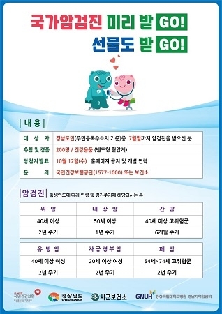 주민등록 주소지 기준 경남에 거주하고 올해 국가암검진 대상자로서 국가 6대 암 중 1종목이라도 7월 말까지 수검하면 추첨을 통해 200명을 선정해 건강용품(밴드용 혈압계)을 제공한다.