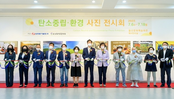 오는 18일까지 울산문화예술회관 제4전시실에서 한국동서발전은 울산환경운동연합과 공동으로 ‘탄소중립·환경 사진 전시회’를 개최하고 기념촬영을 하고 있다. (사진=동서발전 제공)