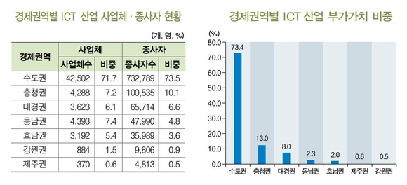하지만 동남권 지역 ICT 사업체수 비중은 전국 대비 7.4%, 종사자수 비중은 4.8%, 부가가치 비중은 2.3%에 불과했다. 특히, 동남권 지역 내에서 ICT 산업이 차지하는 비중은 1.7%에 그쳐 경제권역중 최하위인 것으로 조사됐다.
