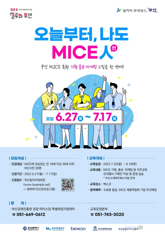 '오늘부터, 나도 마이스人'은 오는 25일부터 8월 18일까지 1개월간 실무자 교육을 거쳐 실전 경험을 위한 모의행사 개최, 채용박람회를 제공하는 프로그램이다. 마이스에 관심있는 만 18세 이상 39세 이하 시민 30명을 선발한다.
