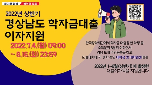 경남도는 도내 대학생들의 교육비 부담 경감을 위해 한국장학재단 학자금 대출 2022년도 상반기(1~6월) 발생 이자를 지원한다고 7일 밝혔다.
