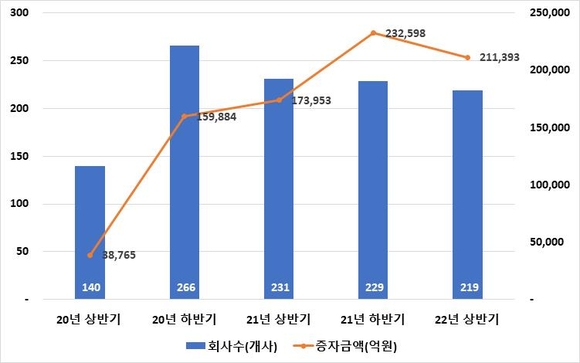 코스닥시장은 156개사로 전년 동기 대비 6.0% 감소했으며, 금액은 3조 9945억원으로 15.5% 증가했다.