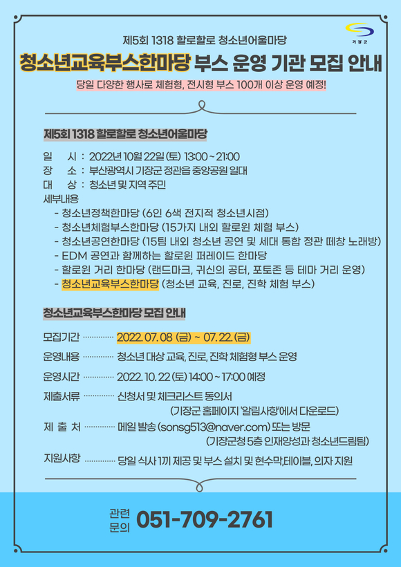 부산 기장군은 '1318 할로할로 청소년 어울마당'의 프로그램 중 하나인 '청소년 교육부스 한마당' 운영 기관을 오는 22일까지 모집한다고 12일 밝혔다.