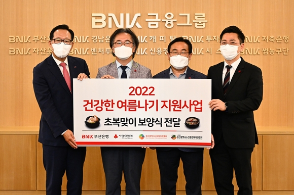 BNK부산은행은 13일 초복(16일)을 맞이해 부산사회복지공동모금회, 부산사회복지관협회, 부산노인종합복지관협회와 함께 '부산은행과 함께하는 건강한 여름나기 보양식 지원사업' 전달식을 가졌다고 밝혔다.