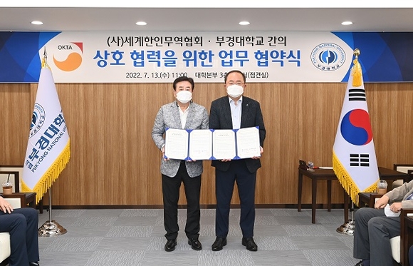 국립부경대학교와 세계한인무역협회(World-OKTA)는 13일 오전 부경대 대학본부 3층 접견실에서 업무협약을 체결했다.