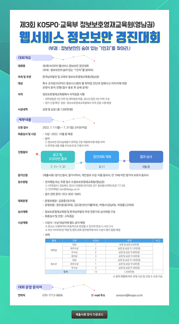 한국남부발전은 '제3회 KOSPO 웹서비스 정보보안 경진대회' 참가자를 오는 31일까지 모집한다고 13일 밝혔다.