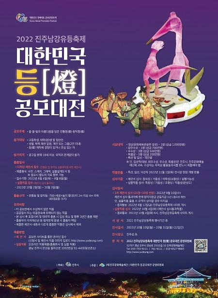 경남 진주시가 주최하고 진주문화예술재단과 등(燈)공모대전 운영위원회가 주관하는 '2022 진주남강유등축제 대한민국 등 공모대전'이 '대한민국 전통등과 창작등'이라는 공모주제로 열린다.