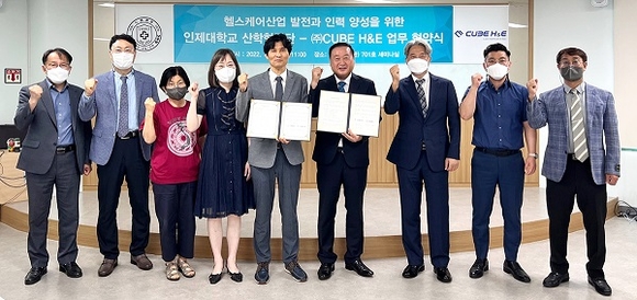 인제대학교 산학협력단과 CUBE H&E는 지난 13일 인제대 인당관 7층 세미나실에서 헬스케어산업 발전과 인력양성을 위한 상호 협력 업무협약을 체결했다.
