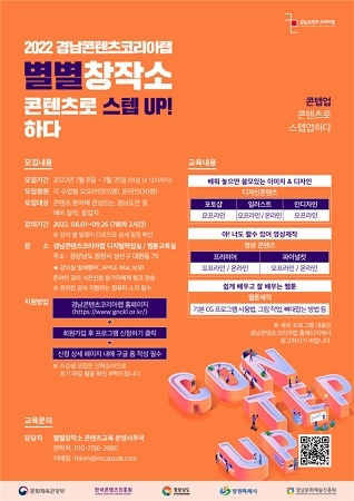 경남문화예술진흥원(이하 진흥원)이 운영하는 경남콘텐츠코리아랩은 콘텐츠 창의인재양성을 위한 ‘경남 별별창작소 콘텐츠로 step up! 하다’ 프로그램을 다음달 1일부터 운영한다.