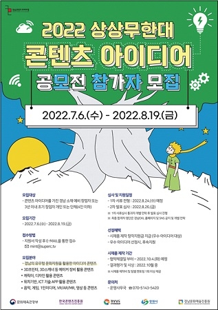 경남문화예술진흥원(이하 진흥원)은 경남의 새로운 문화콘텐츠 아이디어를 발굴하기 위한 ‘상상무한대 콘텐츠 아이디어 공모전’을 개최한다.