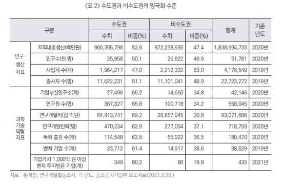 연구원 수, 연구개발비, 특허출원, 기업부설연구소 등의 과학기술역량 관련 지표는 수도권 비중이 65% 내외이며, 기업가치 1000억원 이상 벤처 투자받은 기업 수 등 일부 지표는 수도권에 80% 이상 집중돼 있다.