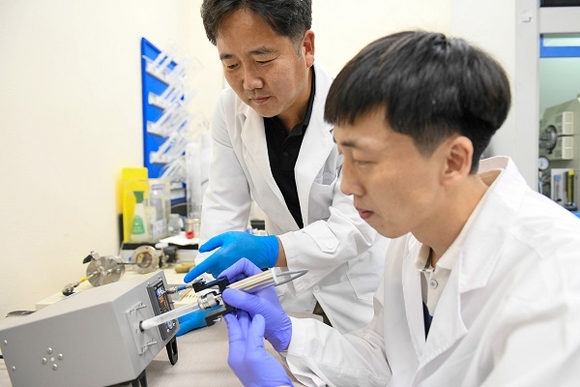 한국전기연구원 하윤철 박사(뒤)가 200℃ 이하 낮은 결정화 온도에서 고체 전해질을 제조하고 있다. (사진=KERI 제공)