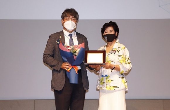 지난 15일 인천 송도 포스코 인재창조원에서 열린 제18회 대한민국 액션러닝 컨퍼런스에서 경상국립대학교 산학협력단은 ‘2022 액션러닝 대상’ 학교부문 대상을 수상하고, 정재우 경상국립대 산학협력단장(왼쪽)이 김형숙 한국액션러닝협회장과 기념촬영을 하고 있다. (사진=경상국립대 제공)