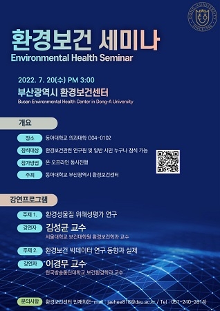오는 20일 오후 3시 동아대 구덕캠퍼스 의과대학(G04-0102)과 영상회의 플랫폼(zoom)에서 온·오프라인으로 동시 진행되는 이번 세미나는 환경보건 관련 연구원 및 일반 시민 누구나 참석 가능하다.