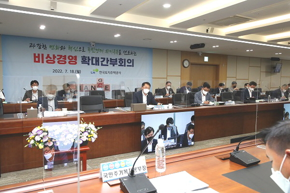 LH는 과감한 혁신, 재무건전성 제고 및 민생경제 지원 등 긴급 경영 현안 논의를 위해 지난 18일 임원, 본사 부서장 및 지역·사업본부장 등이 참여하는 비상경영 확대간부회의를 개최했다.