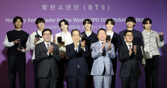 이날 위촉식에는 방탄소년단과 2030부산엑스포 공동 위원장인 한덕수 국무총리, 최태원 대한상공회의소 회장, 박형준 부산시장, 박지원 하이브 대표이사 등이 참석했다.