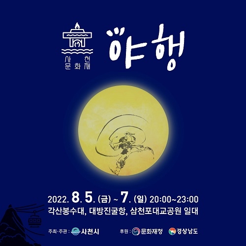 경남 사천의 문화재를 활용한 야간관광콘텐츠 사업인 '2022 사천문화재야행'이 오는 8월 5일부터 7일까지 대방진굴항, 각산 봉수대, 삼천포대교공원 일원에서 열린다.