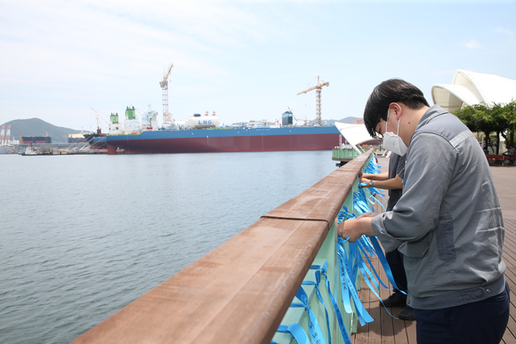 대우조선 청년이사회는 1도크 진수가 성공할 때까지 옥포 오션플라자 수변공원에서 1도크 정상화를 기원하는 '리본 달기 챌린지'를 열고 있다고 21일 밝혔다.