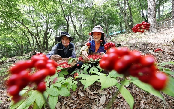 21일 지리산 자락인 경남 함양군 휴천면 산양삼 채종포 단지에서 인부들이 붉게 잘 영근 산양삼 씨앗을 따고 있다. (사진=함양군 제공)