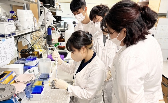 신약개발 연구 프로그램에 참여한 경상국립대 학생들이 실험실에서 체험을 하고 있다. (사진=경상국립대 제공)