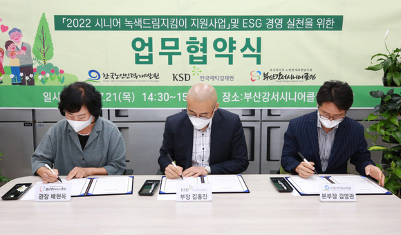 한국예탁결제원은 지난 21일 한국노인인력개발원·부산강서시니어클럽과 '2022 시니어 녹색드림지킴이 지원사업' 및 ESG경영 실천을 위한 업무협약을 체결했다고 밝혔다.