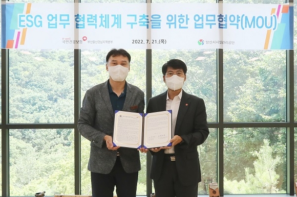 국민건강보험공단 부산울산경남지역본부와 지난 21일 대운산 항노화센터 ‘숲애서’에서 양산시시설관리공단과 ‘ESG 업무협력체계 구축을 위한 업무협약’을 체결했다.
