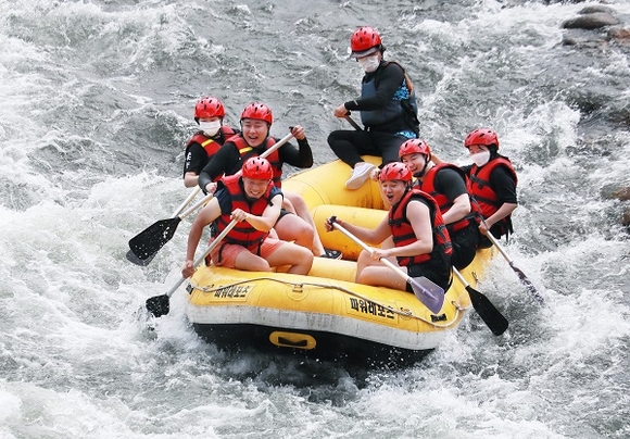 장맛비가 잠시 멈춘 24일 경남 함양군 휴천면 엄천강에서 피서객들이 물살을 가르며 래프팅을 즐기고 있다. (사진=함양군 제공)