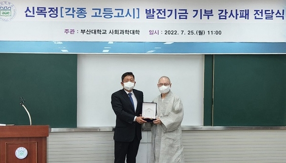 부산대학교 사회과학대학은 지역 대표 사찰인 한국불교 태고종 천불정사의 주지인 고담 스님에게 지난 25일 오전 교내 사회관 2층 행정대학원 최고관리자과정 강의실에서 부산대 각종 고시 준비생들을 위한 발전기금 및 숙식 지원 등에 대한 감사패를 전달하는 행사를 개최했다고 26일 밝혔다.