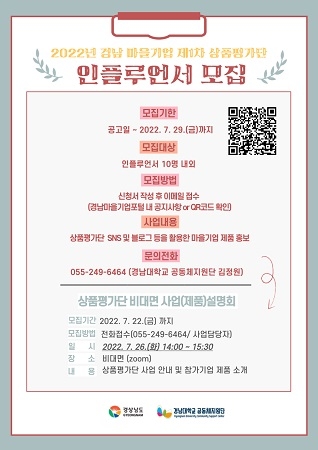 경남대학교 산학협력단 공동체지원단은 오는 29일까지 ‘2022년 경남 마을기업’의 제1차 상품평가단으로 활동할 ‘인플루언서(영향력자)’를 모집한다.