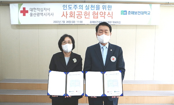 춘해보건대학교는 대한적십자사 울산광역시지사와 26일 도생관 회의실에서 ‘인도주의 실천을 위한 사회공헌 협약’을 체결했다.
