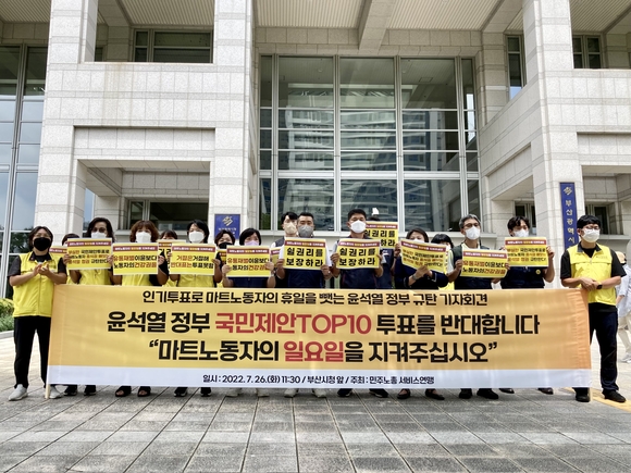 부산 민주노총 서비스연맹은 26일 부산시청 앞에서 기자회견을 열고 "마트노동자의 일요일을 지켜달라"고 토로했다.