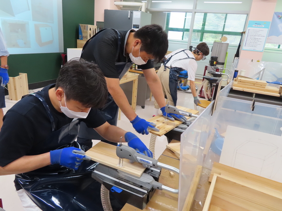 이 연수는 디지로그와 하이테크 과정으로 나눠 운영한다. 디지로그 과정은 '나만의 간이수납함(협탁) 만들기' 주제로 공구 사용법과 아이디어 스케치, 레이저 커터 장비 사용법, 작품 제작 실습 등 내용으로 진행한다. 하이테크 과정은 '메타버스 맵 메이커'와 '조명등 만들기'를 주제로 게더타운 플랫폼 체험, 3D프린터 모델링 및 출력 실습 등 내용으로 구성했다.