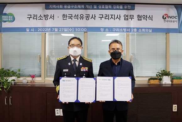 한국석유공사 구리지사는 27일 수도권 시민의 안전과 생명 보호에 기여하기 위해 구리소방서와 응급구조체계 업무협약을 체결했다고 밝혔다.