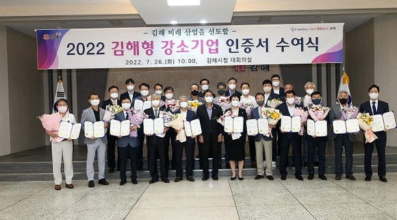 경남 김해시는 지난 26일 시청 대회의실에서 2022년 김해형 강소기업 20개사에 인증서를 수여했다.