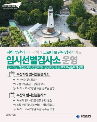 시청 등대광장에 설치되는 시청 임시선별검사소는 29일부터, 부산역 유라시아플랫폼에 설치되는 임시선별검사소는 8월 5일부터 운영을 재개한다. 다만, 임시선별검사소에서는 PCR검사 우선순위 대상자만 검사가 가능하다.
