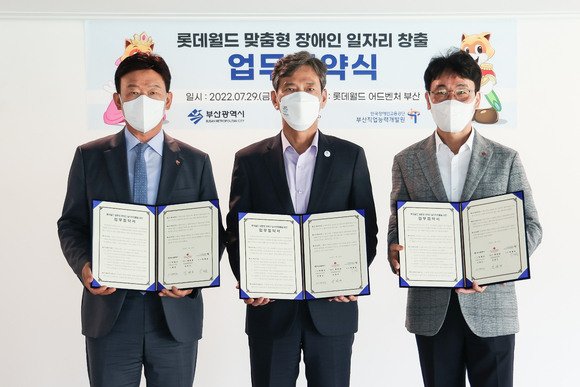 롯데월드 어드벤처 부산은 29일 부산시, 한국장애인고용공단 부산직업능력개발원과 함께 맞춤형 장애인일자리 창출을 위한 3자 업무협약을 체결했다고 밝혔다.