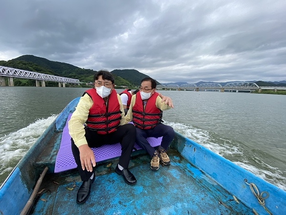 홍태용 김해시장이 3일 오후 김해 상수원인 생림면 창암 일원 낙동강의 녹조 발생 상황을 살폈다.