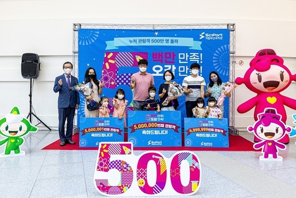 5일 국립부산과학관 1층 로비에서 500만 번째 관람객 및 전·후 관람객 총 3팀을 선정해 문화상품권과 기념품을 증정하고 500만 명 돌파를 축하하는 행사를 진행했다.