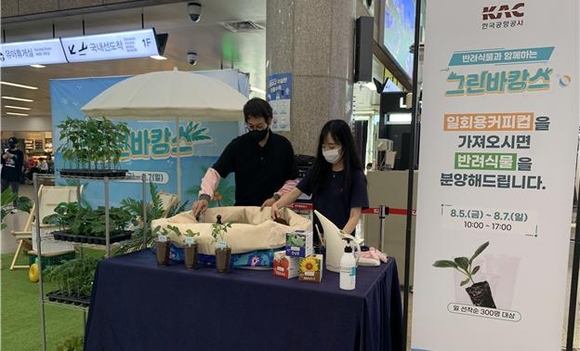 이 이벤트는 국내선 이용 여객이 다 쓴 일회용 음료컵을 지참하면 식물 모종을 받아 반려식물 화분을 제작하고, 바다에 버려진 유리를 수거해 목걸이를 만드는 바다 유리 공예 체험을 하는 행사다.
