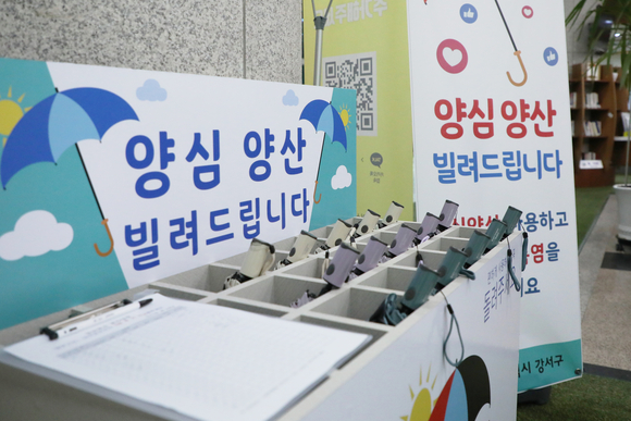 부산 강서구는 양산 대여사업을 실시하고 있다. 사진은 구청 1층 종합민원실에 비치된 양심양산 대여공간.(사진=강서구 제공)